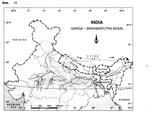 (i) Art an outline map of the Indian sub-continent, draw the rivers Ganga and Brahmaputra from the source to the mouth Also show the important tributaries of both the rivers.