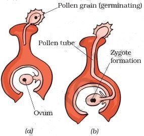 when pollen grain landed on the stigma of the suitable flower, it makes a tiny through style to the ovary. The pollen grain carries male gamete which met the female gamete in the ovule and fertilsation takes in flowers. The cell which results after fusion of the gametes is called a zygote which further develops into embryo.