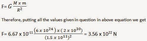 16. Calculate the force of gravitation between the earth and the Sun, given that the mass of the earth = 6 × 1024 kg and of the Sun = 2 × 1030 kg. The average distance between the two is 1.5 × 1011m.