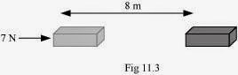 1. A force of 7 N acts on an object. The displacement is, say 8 m, in the direction of the force (Fig. 11.3). Let us take it that the force acts on the object through the displacement. What is the work done in this case?